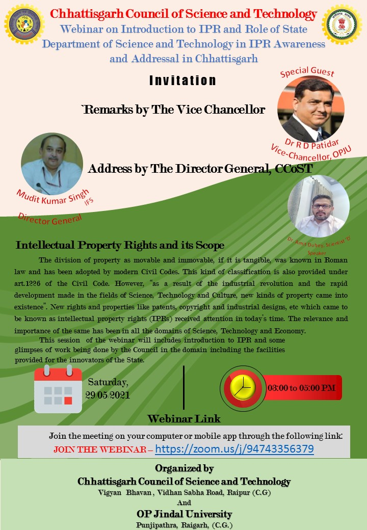 1. Center of Research Excellence (CRE) & IIC OPJU, in association with CGCOST, organized a webinar titled “INTELLECTUAL PROPERTY RIGHTS AND ITS SCOPE” on May 29, 2021, at 3:00 PM.