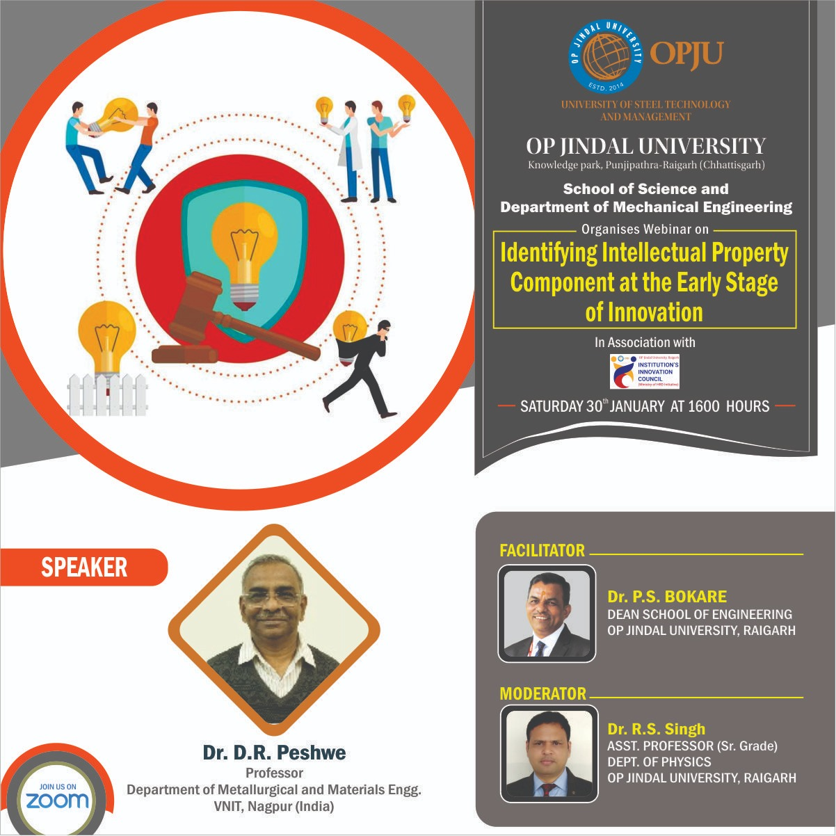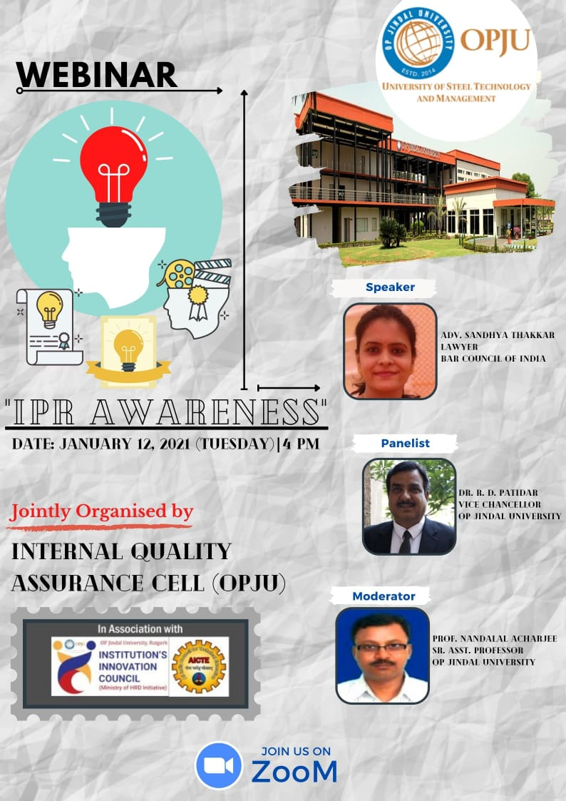 2. IQAC & IIC OPJU Raigarh organized a webinar on “AWARENESS IN IPR” on January 12, 2021, at 4:00 PM.