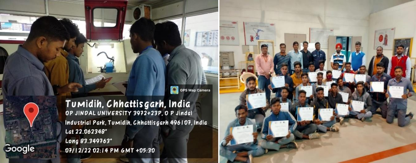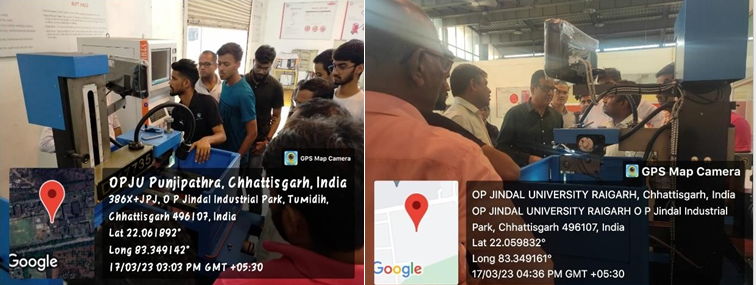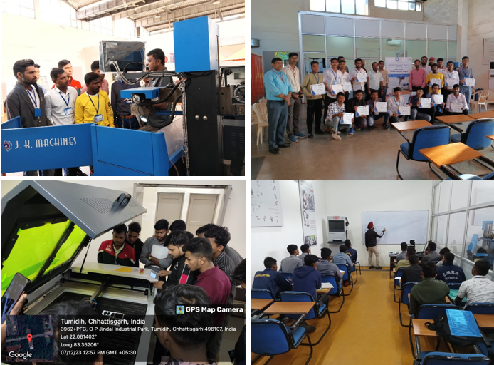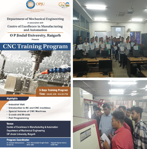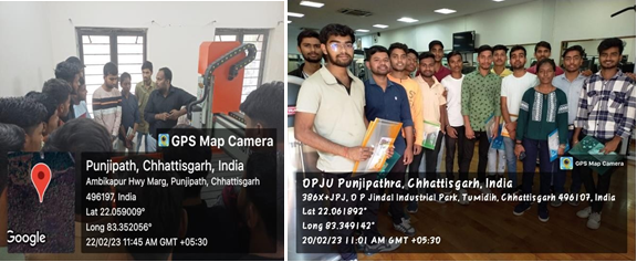 12. The Centre of Excellence in Manufacturing and Automation (CoEMA), in association with the Department of Mechanical Engineering have successfully organized a five-days CNC training program during 20 - 24th February 2023, for the final year Diploma Students of Kirodimal Government Polytechnic Institute, Raigarh. The students had hands-on training session in CNC Milling, CNC Lathe CNC engraving, CNC laser cutting and 3D printing. The students also learned about Robotic Welding technology available at OPJU. The training program was concluded by a valedictory session followed by certificate distribution. The centre is focused to conduct skills development programs for the students of Chhattisgarh and central India.