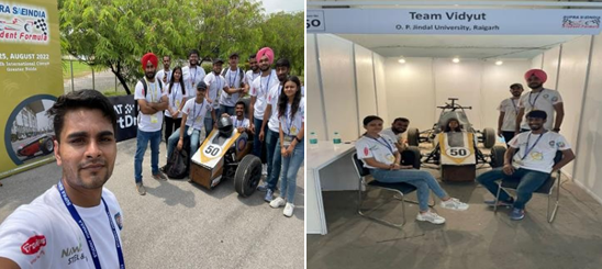 11. The Department of Mechanical Engineering at OPJU believes in experiential learning and hence continuously provides opportunities to its students to showcase their talent in the National arena. Moving in the same line, this year also the student team "VIDYUT" as a part of the SAE Collegiate Club designed and fabricated their "Formula One Car" under the guidance of Faculties & Staff of Department of Mechanical Engineering and Centre of Excellence in manufacturing & Automation. They participated in the SAE-SUPRA Formula contest, organised between 22nd - 25th August 2022 at Buddh International Circuit, Greater Noida. OPJU was the only University from Chhattisgarh to participate in this event.