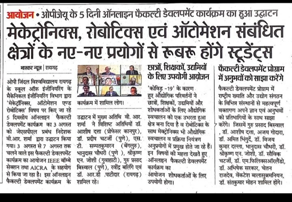 Five-Day Online Faculty Development Programme (FDP) on “Mechatronics, Automation and Robotics” in association with IEEE Bombay Section, Centre of Excellence in Welding Technology and All India Council for Robotics and Automation (AICRA) from August 3-7, 2020.