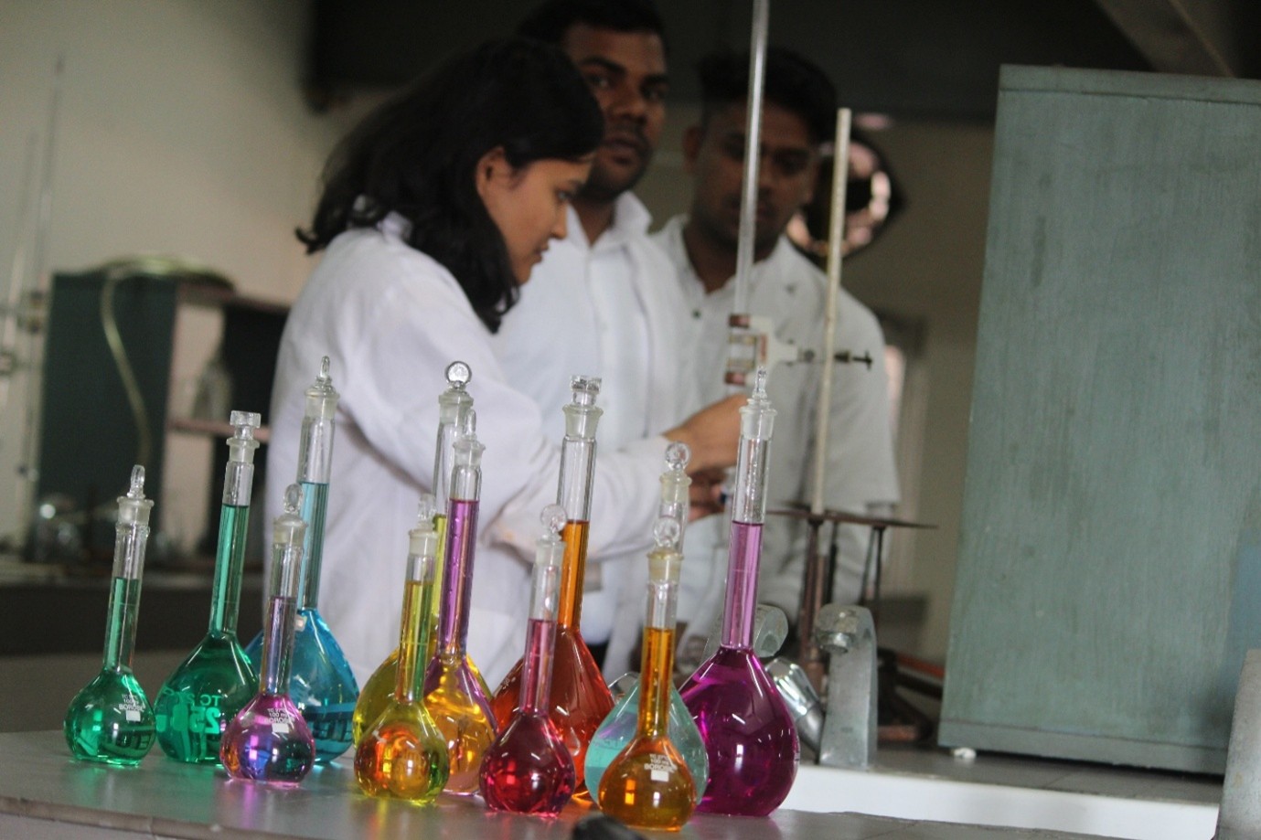 Learning by doing is the driving philosophy of the Department of Chemistry. The Department has state of the art laboratory with latest instruments to support teaching–learning. It caters the requirements for UG, PG and provide support for research. The major equipment & instruments available are Automatic Polarimeter, Fume Hood, Colorimeter, Digital Spectrophotometer, Vernier Lab Quest System with sensors like Conductivity Probe, pH sensor, ORP sensor, Gas pressure sensor and Drop Counter, Digital Conductivity Meter, Digital pH Meter, Digital Potentiometer, Bomb Calorimeter, Abel’s Flash & Fire Point Apparatus (Open & Closed Cup), Muffle Furnace, Hot Air Oven, Digital water bath, Hot plate, Heating mantle, Magnetic stirrer, Melting point apparatus, electronic balance, etc.