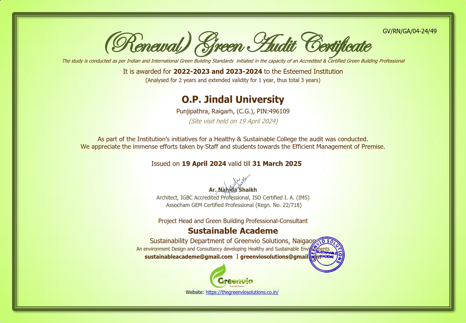 O. P. Jindal University thrives to emerge as a green and sustainable campus, which not only works on the creating an environment of clean and green in the campus but also actively participates in constructing a sustainable society through its commitment to education, research, community engagement, and the evolution of its physical environment. It transcends being merely ecologically responsible; its core mission includes addressing societal challenges through integrated education and research initiatives and fostering harmonious campus development in sync with its local surroundings. In essence, it signifies a holistic dedication to enhancing the welfare of individuals through pragmatic and diverse means.