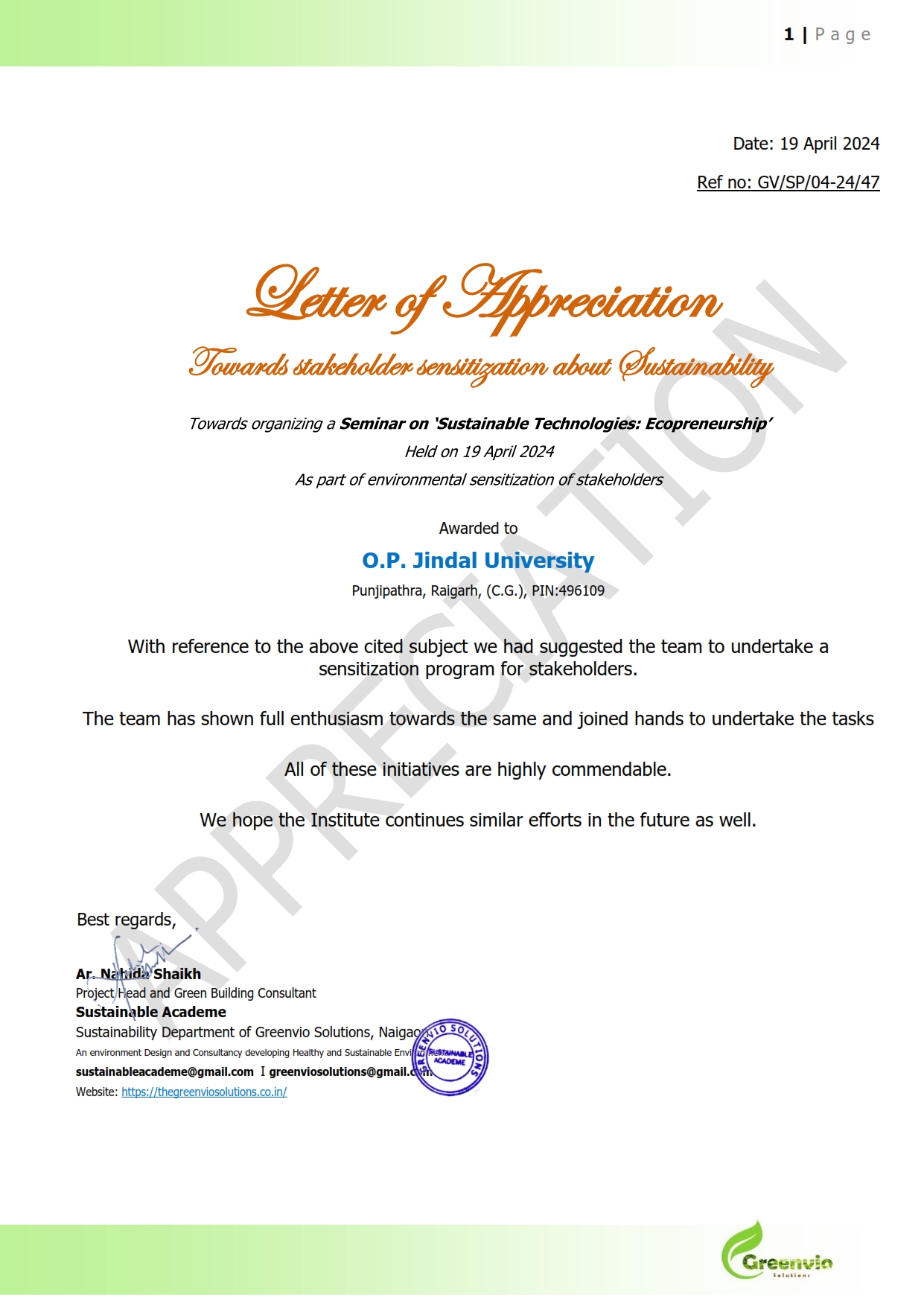 OP Jindal University is unwavering in its commitment to advancing sustainability through education and research, recognizing that knowledge and innovation are key drivers in addressing pressing global environmental challenges.