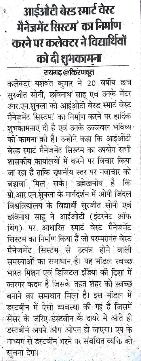 IOT WASTE SMART BASED MANAGEMENT SYSTEM" PROJECT DONE BY OP JINDAL UNIVERSITY STUDENTS KIRANDUT,