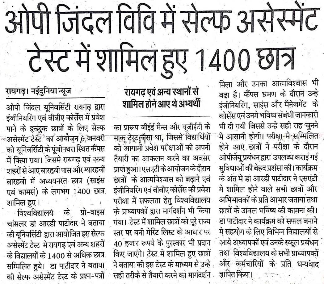 1400 STUDENTS PARTICIPATED IN SELF ASSESMENT TEST 2019 AT OP JINDAL UNIVERSITY NAYIDUNIA,