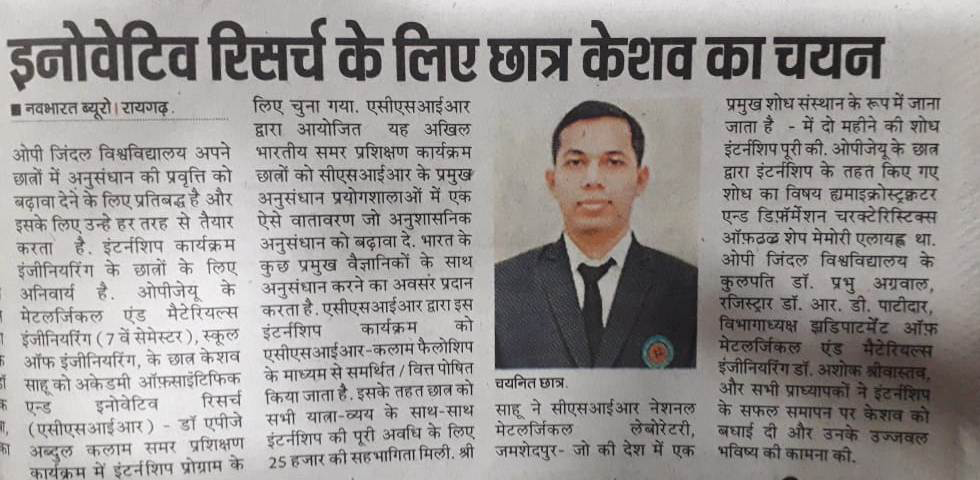 OPJU METALLURGICAL STUDENT SELECTION FOR INNOVATIVE RESEARCH