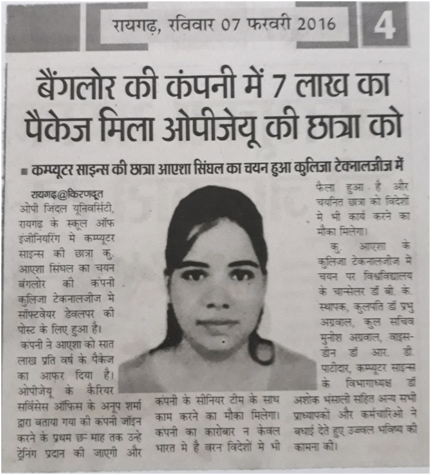 OPJU student gets 7 lac salary package from Bangalore Company